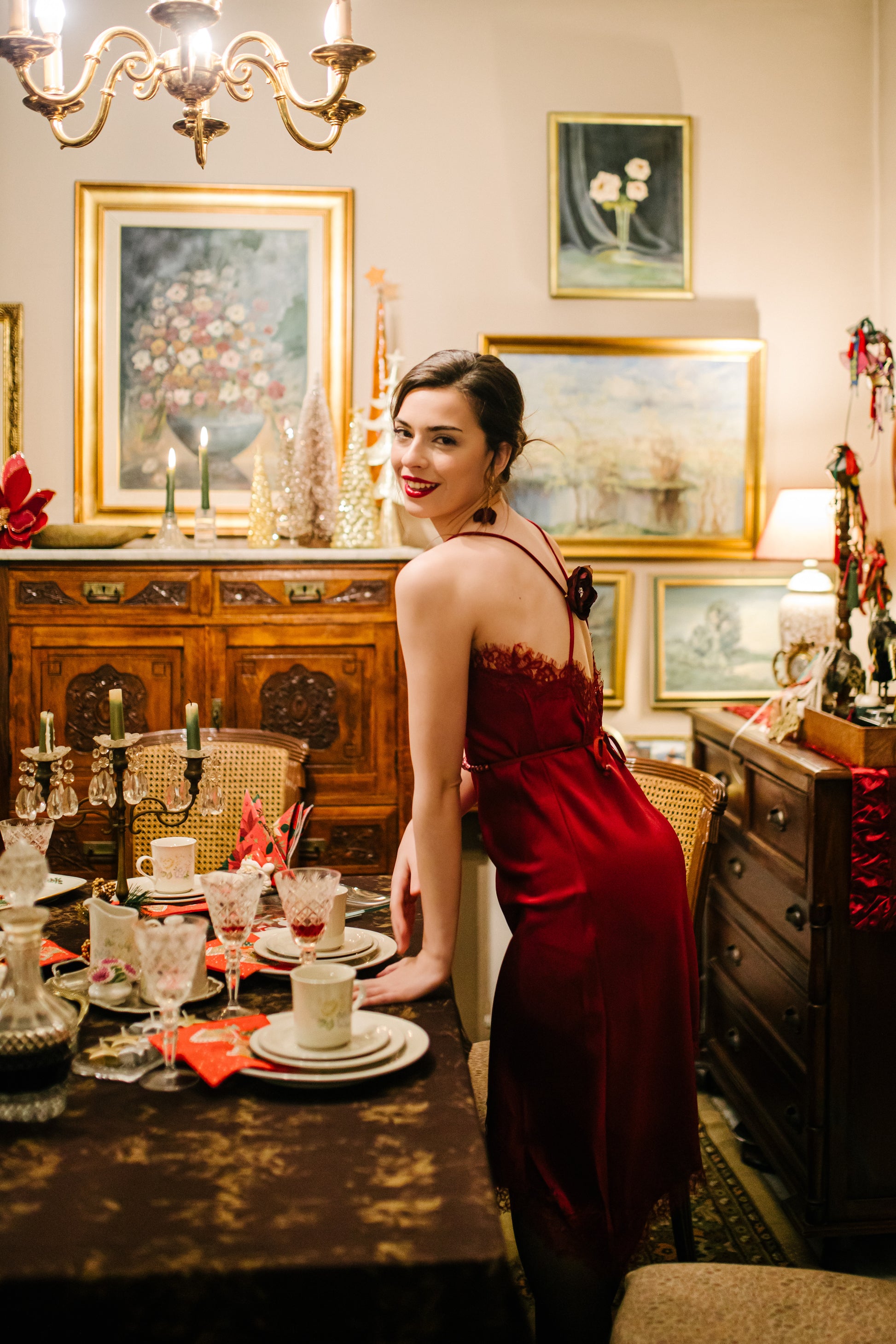 Satin midi dress in burgundy, with lace. It comes with a pearl belt