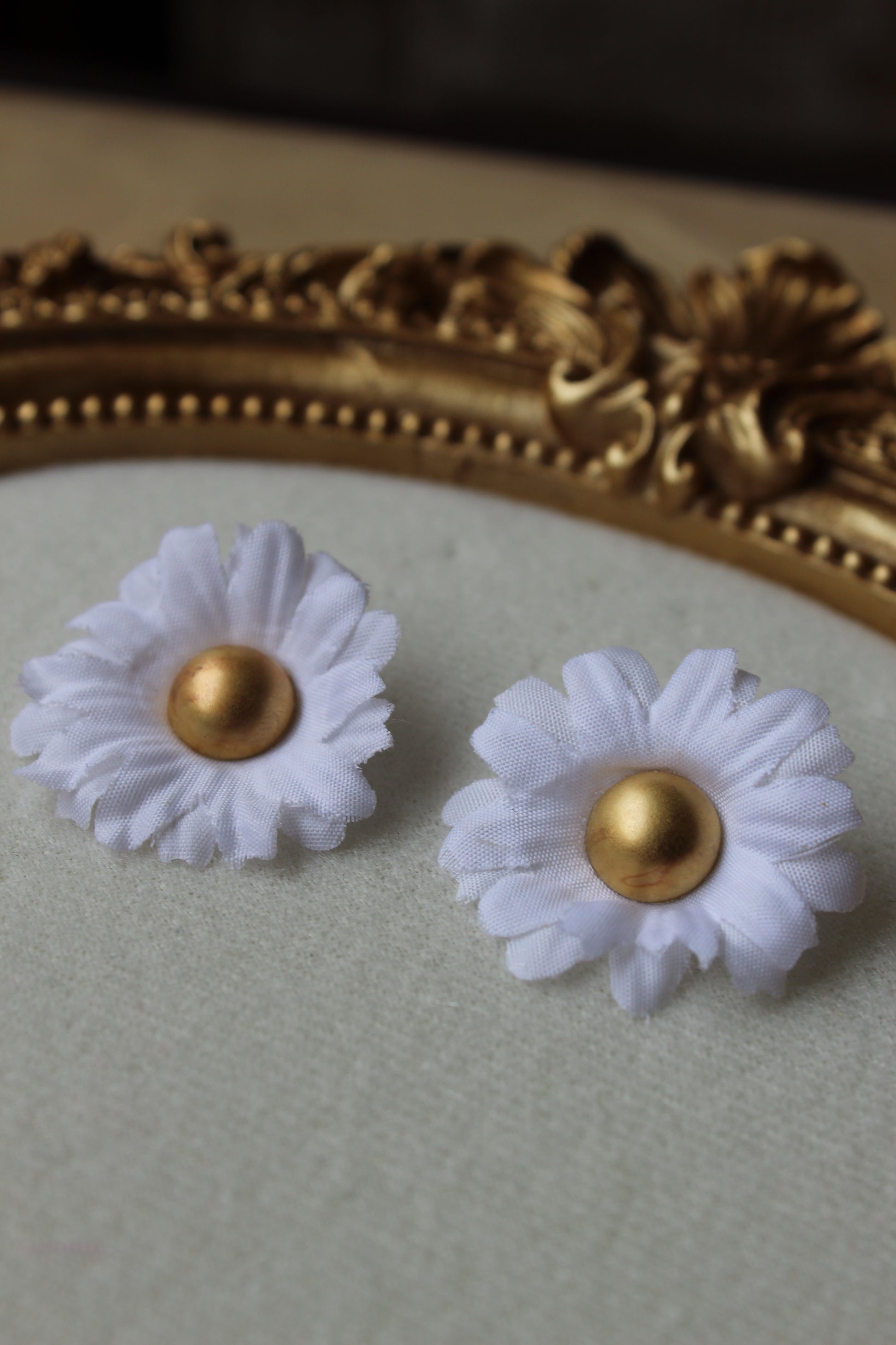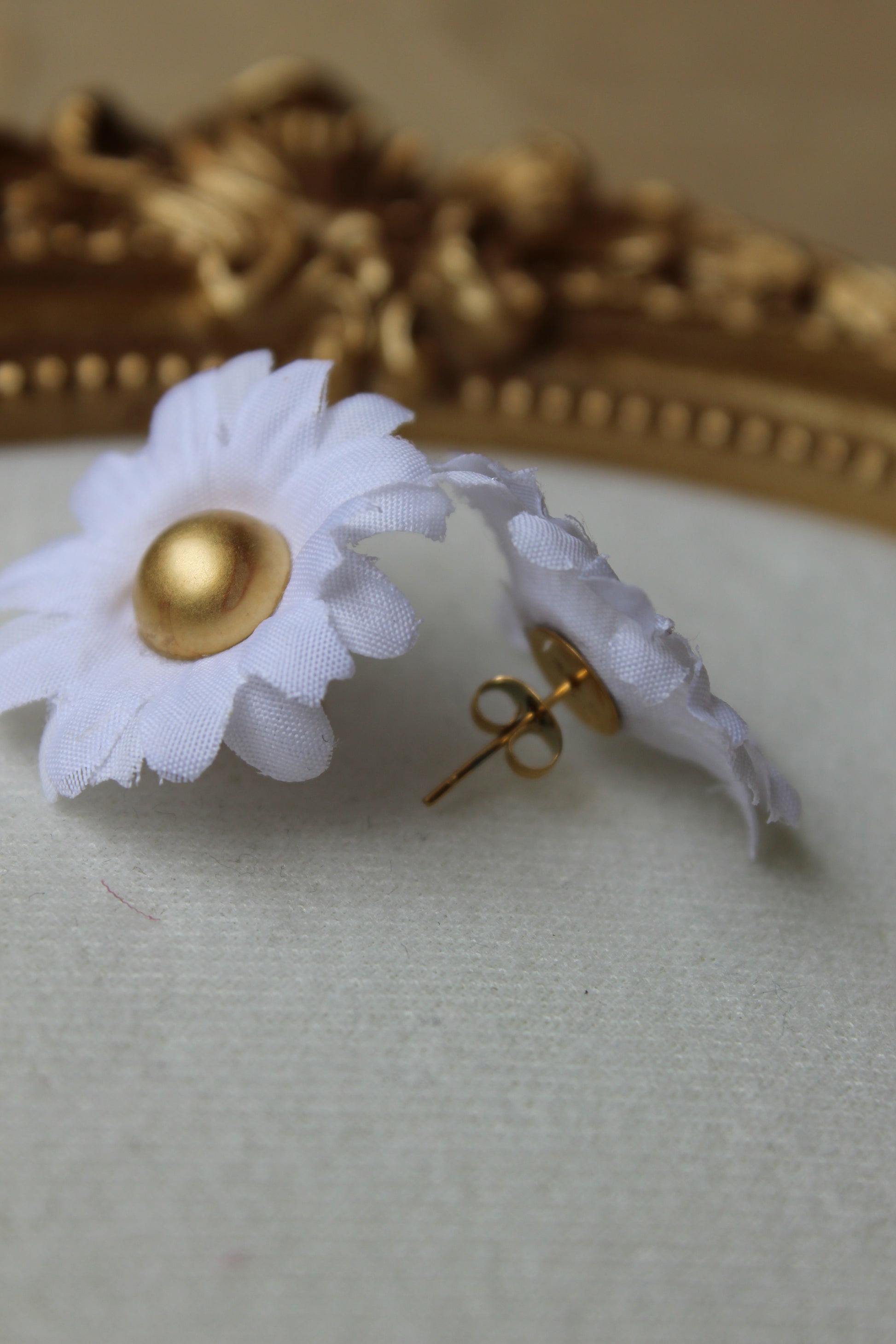 Fabric daisy earrings, with an acrylic element and a stainless steel base