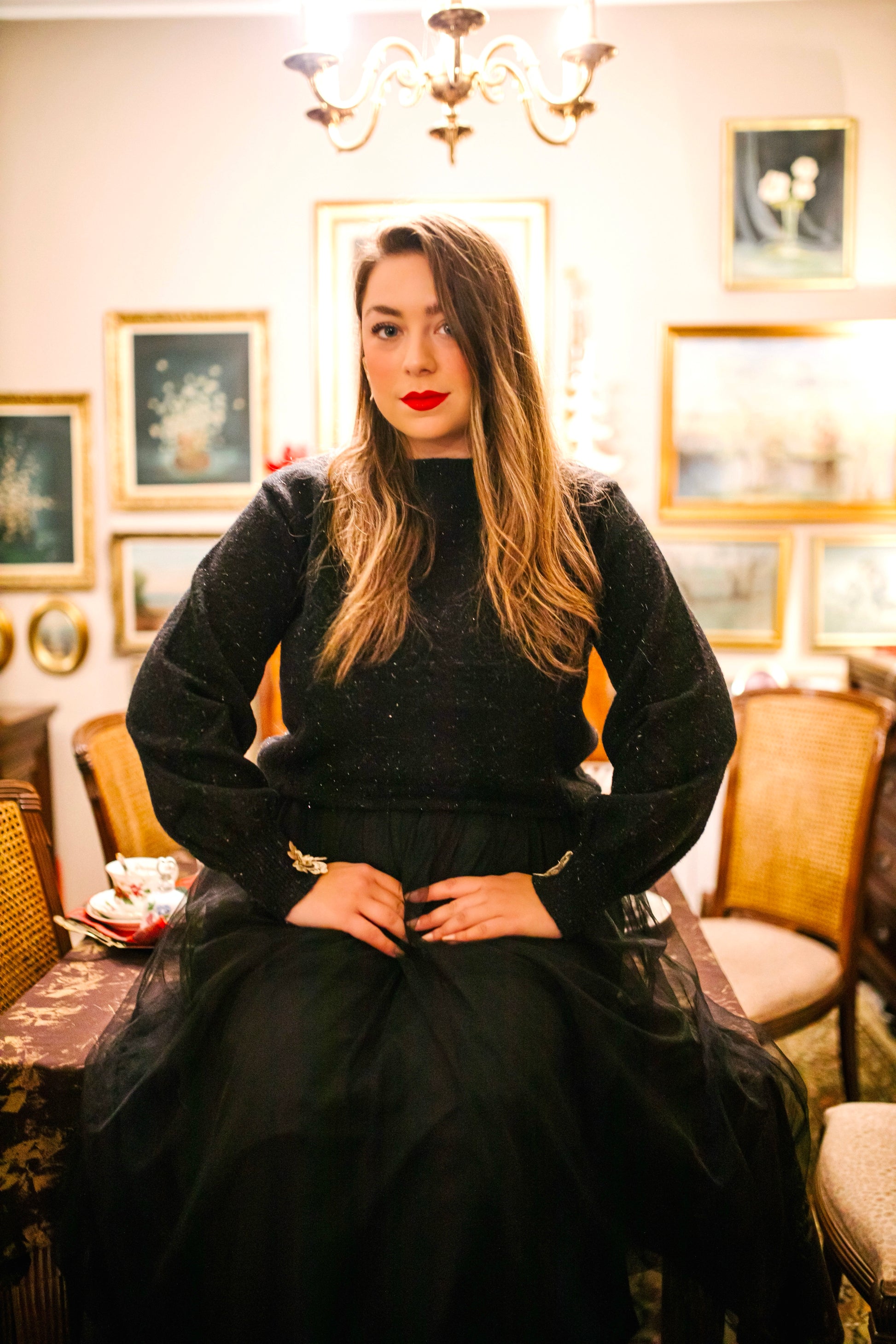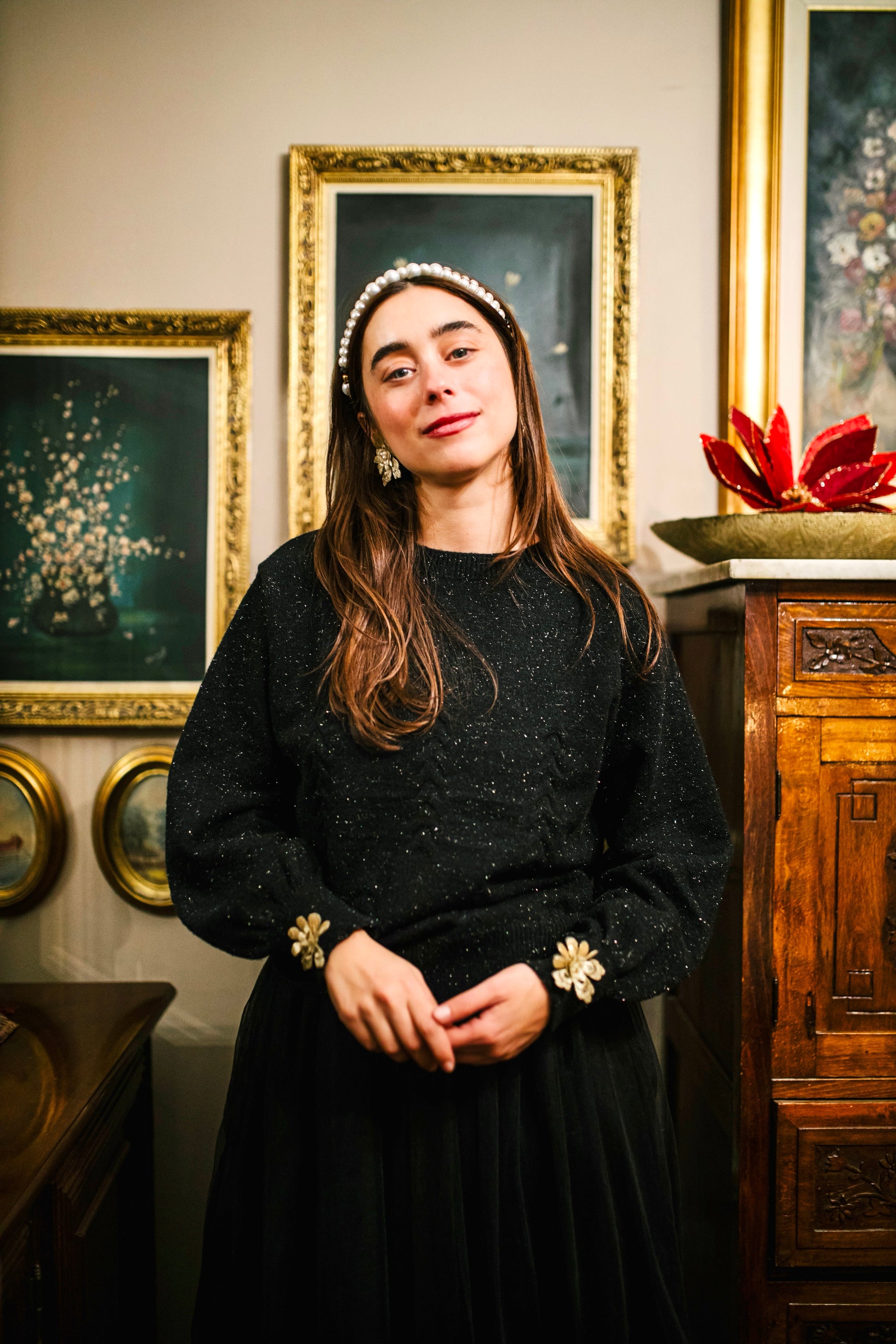 Black ,one size sweater with golden thread and embroidered sequin golden flowers on the sleeves.