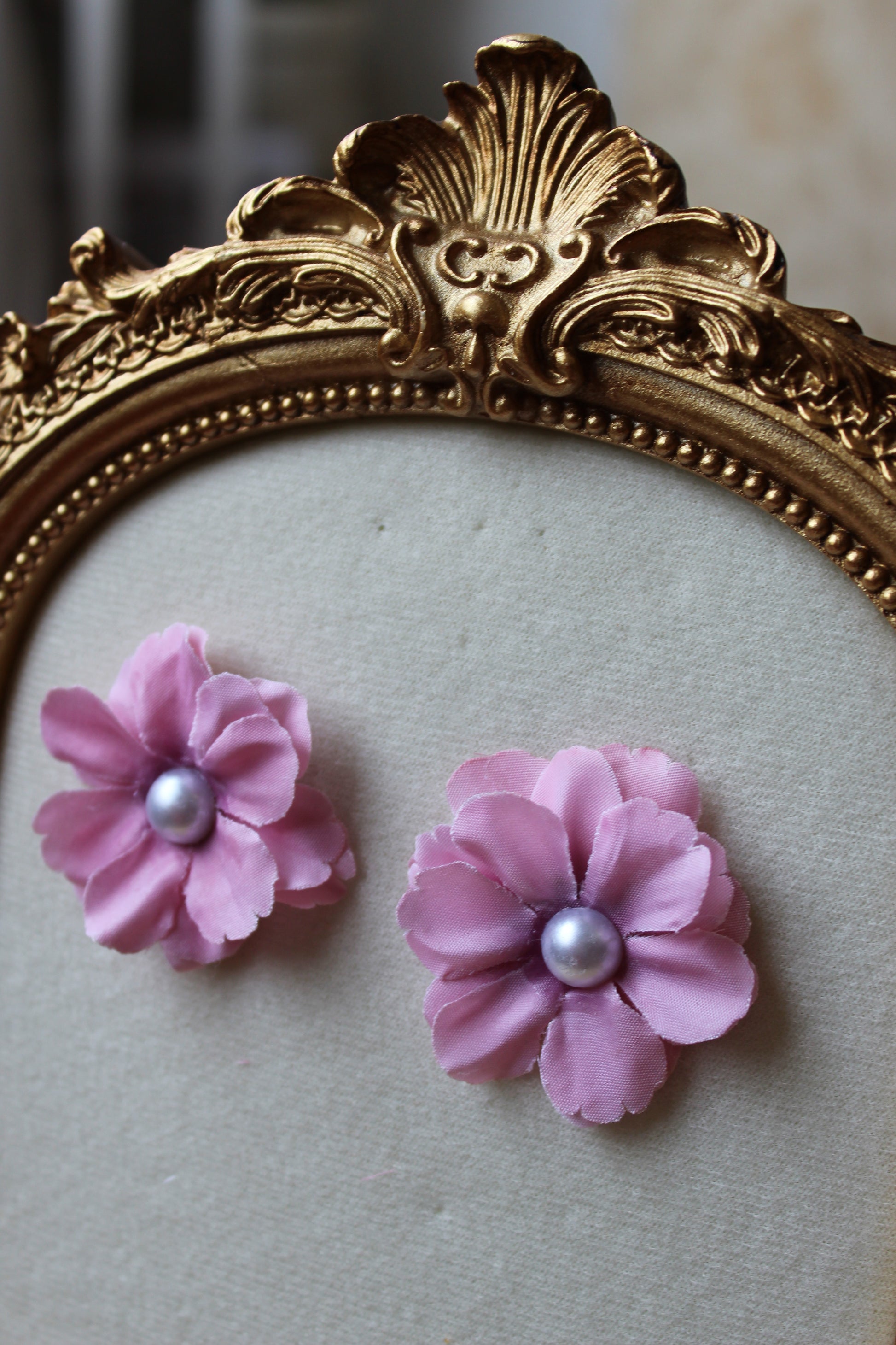 Handmade earrings, with a fabric cherry blossom flower, a stainless steel base and an acrylic cabochon